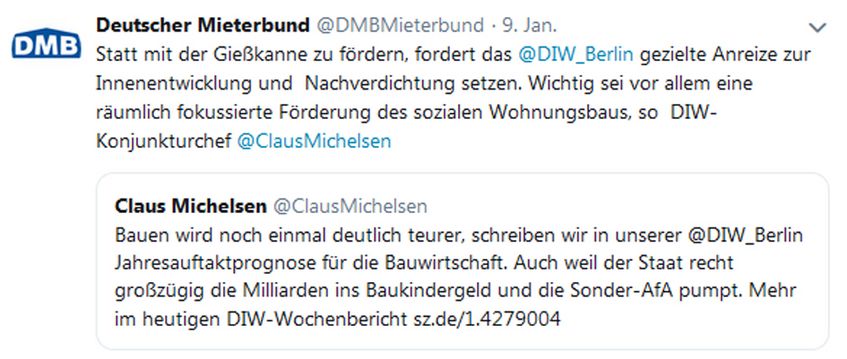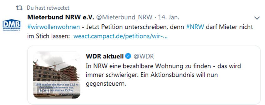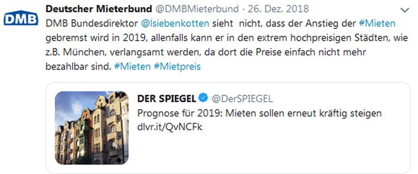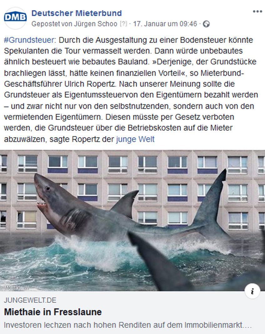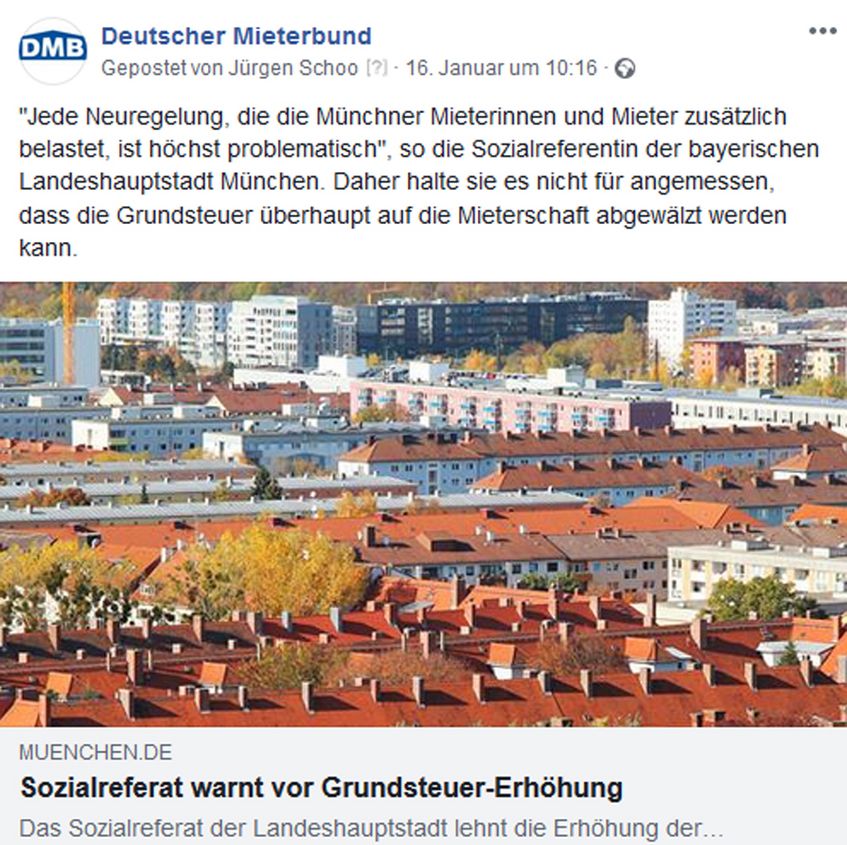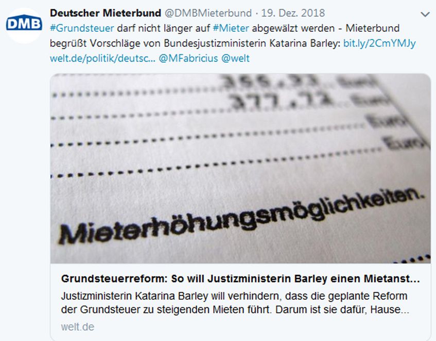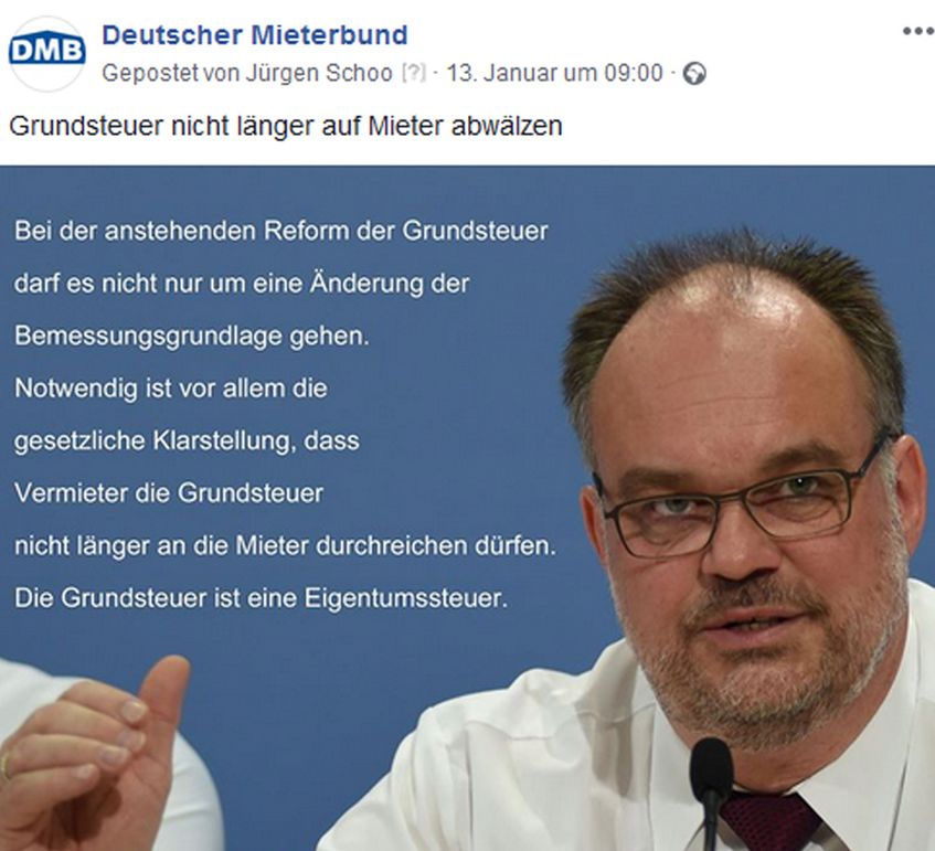 Neben den Mieten führt auch der Anstieg der Nebenkosten zur Verteuerung des Wohnens. Auch die anstehende Reform der Grundsteuer droht zu einem weiteren Kostentreiber zu werden. Aus Sicht des Mieterbundes dürfte diese Eigentumssteuer gar nicht auf die Mieter umgelegt werden. Auch durch die Beiträge auf unseren Social-Media-Seiten wollen wir auf diese Themen aufmerksam machen. Weitere Diskussionsbeiträge und Informationen finden Sie unter https://www.facebook.com/DMBMieterbund/ und https://twitter.com/DMBMieterbund