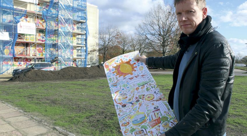 Der Leipziger Michael Fischer-Art bemalt graue Wohnblöcke mit farbenfrohen Motiven - derzeit in Hoyerswerda