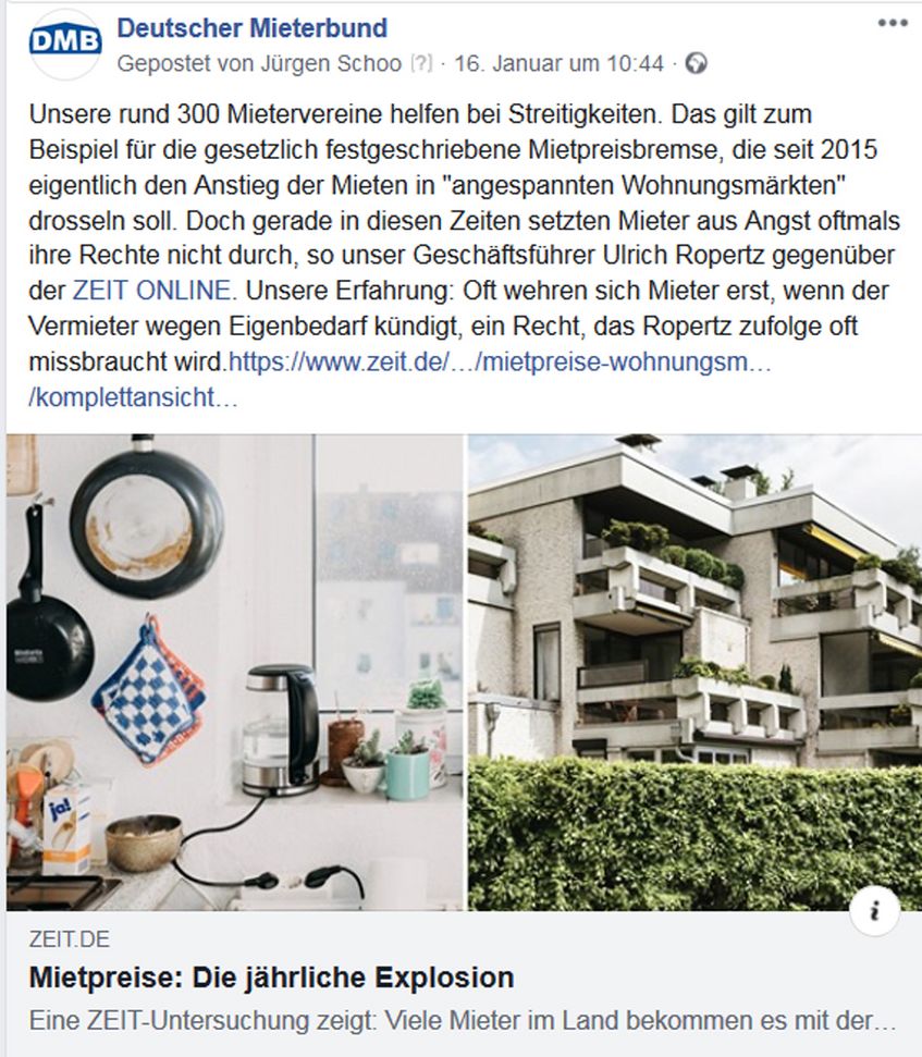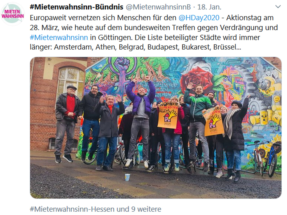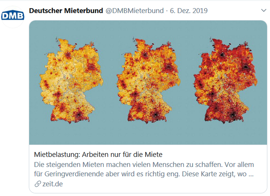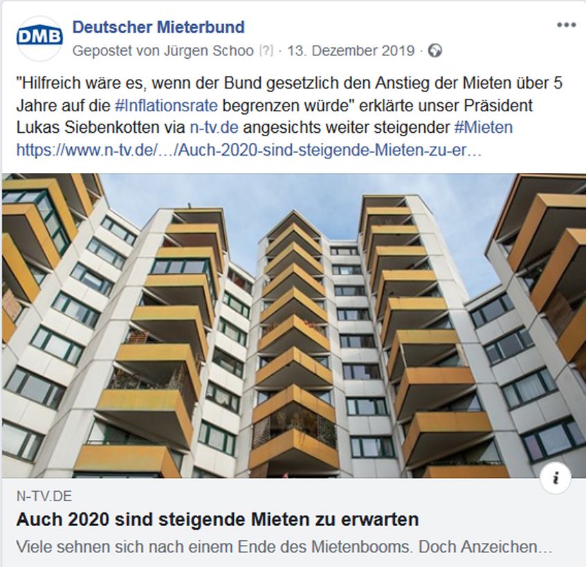 Angesichts steigender Mieten wählte die Wochenzeitung „Zeit“ für ihre Berichterstattung im Dezember 2019 den Titel: „Mietbelastung – Arbeiten nur für die Miete“. Vor Ort gibt es unter Beteiligung der Mietervereine immer mehr Versuche, den Mietanstieg zu stoppen. Einige Beispiele: In Berlin ist der Mietendeckel schon fast Gesetz, in Bayern fordert eine Volksinitiative #6 Jahre Mietenstopp und in Düsseldorf wird ein Bürgerbegehren „Wohnen bleiben im Viertel“ angestrengt. Mieterbund-Präsident Lukas Siebenkotten regte als bundesweite Lösung eine Begrenzung des Mietanstiegs für fünf Jahre auf die Inflationsrate an. Europaweit startet derweil die Mobilisierung für den Housingday2020 am 28. März 2020. Aktuelle Informationen finden Sie wie immer unter https://www.facebook.com/DMBMieterbund/ und https://twitter.com/DMBMieterbund