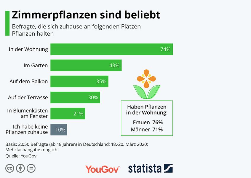 Eine Wohnung ohne Pflanzen? Für die meisten Menschen hierzulande ist das nicht vorstellbar. Laut einer Umfrage von Statista und dem Marktforschungsinstitut YouGov vom Frühjahr 2020 haben rund drei Viertel aller Bundesbürger:innen (74 Prozent) Pflanzen in ihrer Wohnung. Auch auf Balkon (35 Prozent), Terrasse (30 Prozent) und den Fensterbrettern (21 Prozent) grünt und blüht es. Nur zehn Prozent der Befragten haben keine Pflanzen zu Hause.