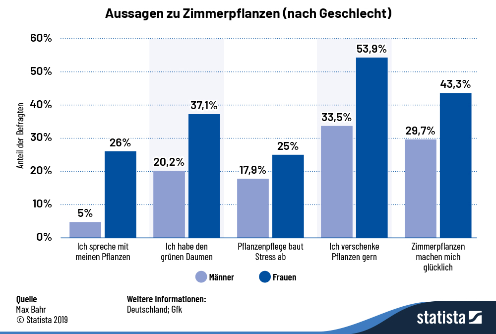 Laut dieser Umfrage trauen sich Frauen aber offenbar deutlich mehr in Sachen Pflanzenpflege zu: Fast doppelt so viele Frauen (37,1 Prozent) wie Männer (20,2 Prozent) sagen von sich selbst, sie hätten den „grünen Daumen“. Der beinhaltet bei einigen sogar mehr als nur gießen und umtopfen: 26 Prozent der Frauen sprechen mit ihren Pflanzen. Bei den Männern zweifeln offenbar aber die allermeisten daran, dass Palme oder Gummibaum an Gesprächen interessiert sind: Nur fünf Prozent von ihnen kommunizieren demnach mit ihren Zimmerpflanzen.