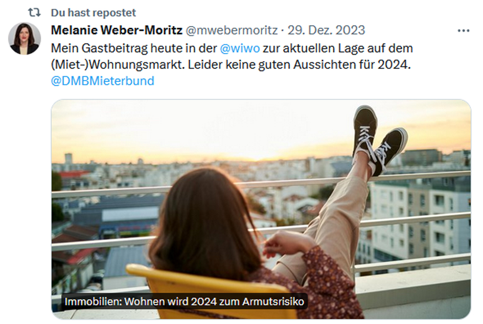 „Die Lage am Wohnungsmarkt ist angespannt – und wird sich 2024 weiter zuspitzen“, so unsere Bundesdirektorin Dr. Melanie Weber-Moritz in ihrem Gastbeitrag in der „Wirtschaftswoche“. Eine aktuelle Studie des Pestel-Institutes zeigt: Weil Wohnraum knapp ist, liegt die staatliche Leistung für Mieten bei Übernahme der Kosten fürs Wohnen häufig über der Durchschnittsmiete. „Damit treibt der Staat die Mieten in die Höhe“, fasst DMB-Präsident Lukas Siebenkotten im ARD „Morgenmagazin“ zusammen. Auch ländliche Räume sind betroffen.