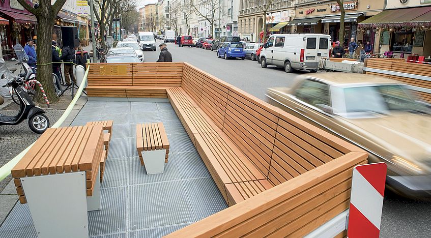 Um mehr Begegnungszonen in den Städten zu schaffen, sind in der Bergmannstraße in Berlin-Kreuzberg sogenannte Parklets eingerichtet worden.