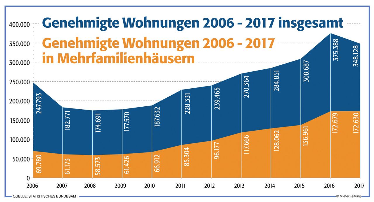 Für das dringend benötigte Neubauvolumen sind diese Zahlen dennoch keine guten Vorzeichen. Die knapp 350.000 genehmigten Wohnungen entsprechen keineswegs dem Neubaubedarf von rund 400.000.