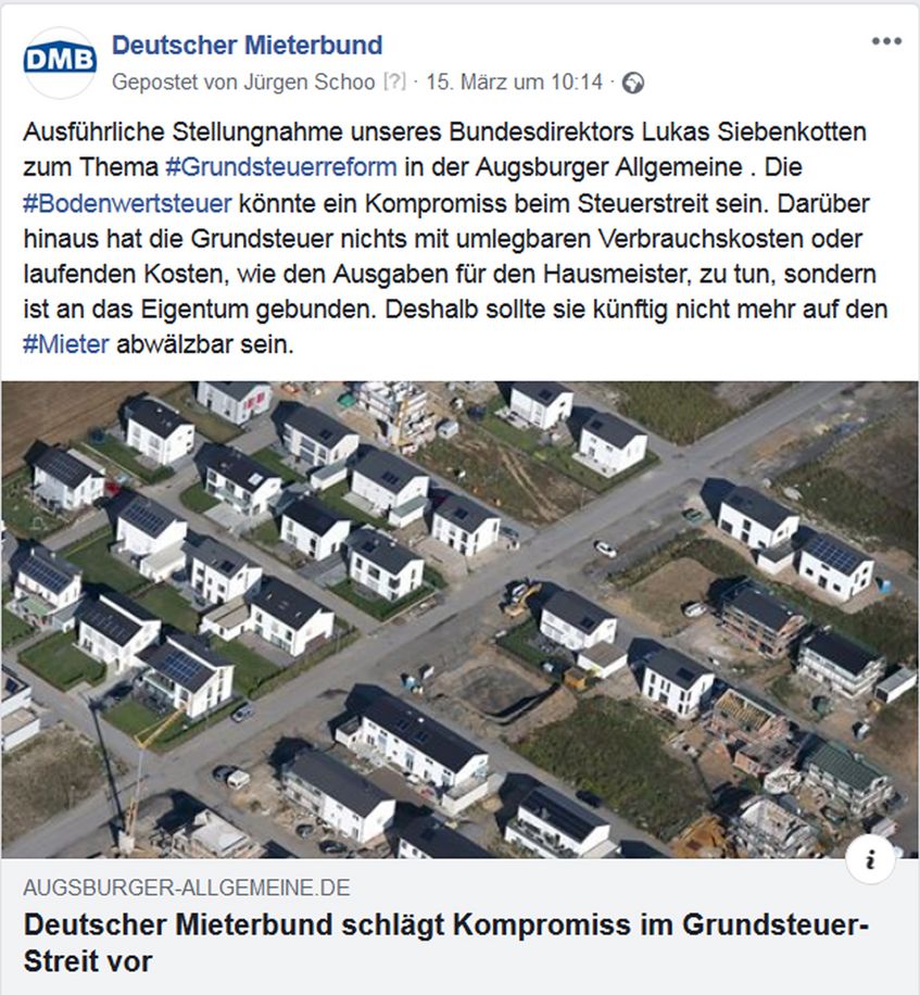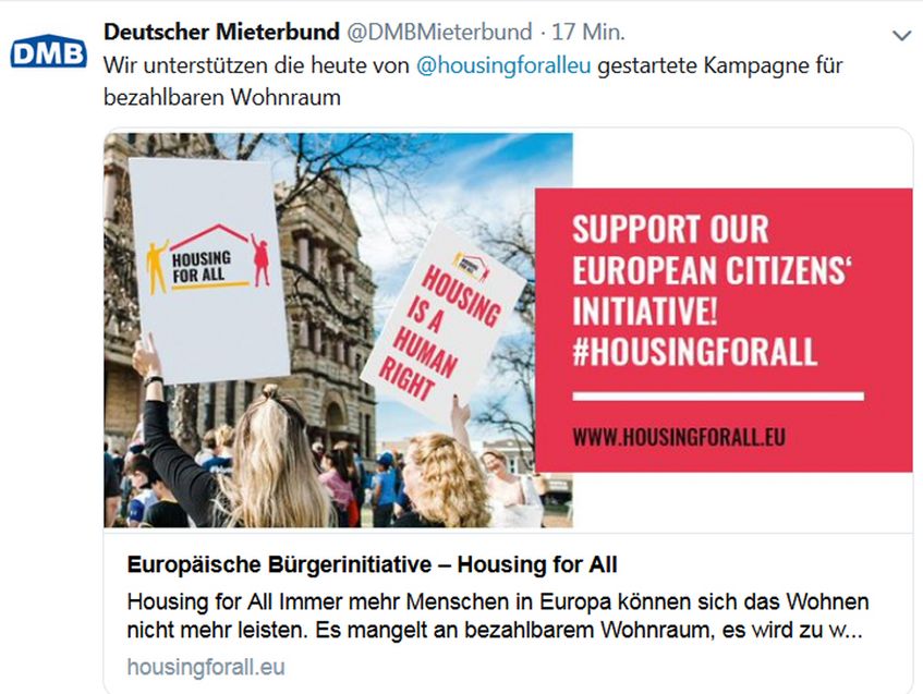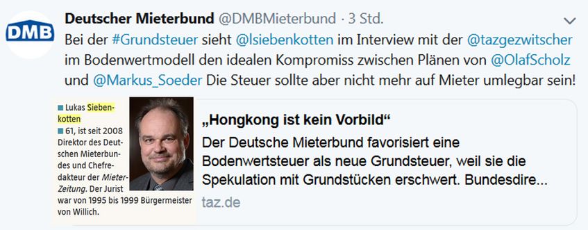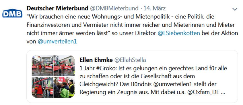 „Wir brauchen eine neue Wohnungs- und Mietenpolitik – eine Politik, die Finanzinvestoren und Vermieter nicht immer reicher und Mieterinnen und Mieter nicht immer ärmer werden lässt“, so Mieterbund-Direktor Lukas Siebenkotten beim Protest des Bündnisses „Reichtum umverteilen”. Auf unseren Social-Media-Seiten protestieren wir gegen die Umlage der Grundsteuer auf die Mieter, gegen steigende Mieten und für ein Recht auf Wohnen in Europa. Aktuelle Informationen finden Sie unter https://www.facebook.com/DMBMieterbund/ und https://twitter.com/DMBMieterbund