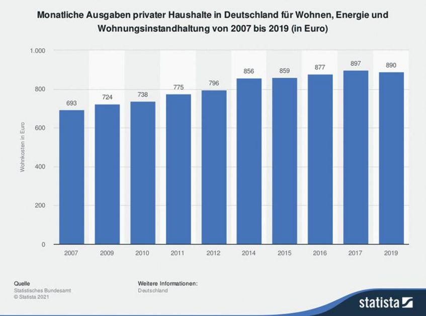 Insgesamt machten die Ausgaben für Wohnung, Energie und Wohnungsinstandhaltung laut den Angaben des Statistischen Bundesamtes im Jahr 2019 rund 34,6 Prozent der gesamten privaten Konsumausgaben aus.