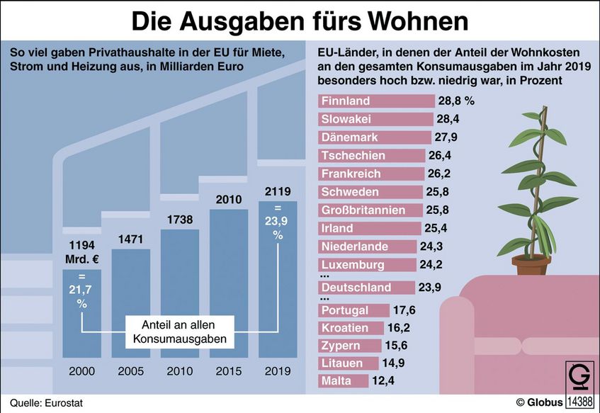 Am teuersten wohnten demnach die Finnen: In Finnland bezahlten Privathaushalte im Jahr 2019 rund 34,6 Milliarden Euro für Wohnen, Strom, Wasser, Gas und andere Brennstoffe. Das entspricht einem Anteil von fast 29 Prozent an den Ausgaben der Privathaushalte. Auch in der Slowakei (28,4 Prozent) und Dänemark (27,9 Prozent) waren die Anteile besonders hoch. In Tschechien, Frankreich, Schweden, Großbritannien und Irland machten die Wohnkosten ebenfalls mehr als ein Viertel der privaten Konsumausgaben aus. Deutschland liegt laut der Eurostat-Berechnung mit rund 24 Prozent relativ genau im EU-Durchschnitt.