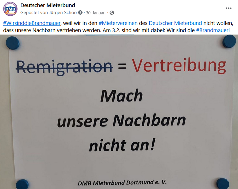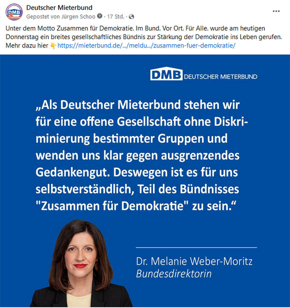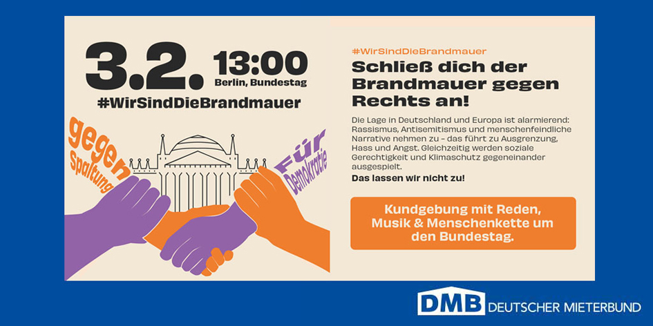 Der Deutsche Mieterbund ist eine demokratische und pluralistische Organisation, die sich für alle Mieterinnen und Mieter einsetzt, unabhängig von Herkunft, sexueller Identität und politischer Orientierung. Er steht für eine offene Gesellschaft ohne Diskriminierung. Deshalb wirbt der DMB in Bündnissen für eine offene, demokratische, vielfältige und solidarische Gesellschaft und engagiert sich gegen den Rechtsruck in Deutschland und Europa.