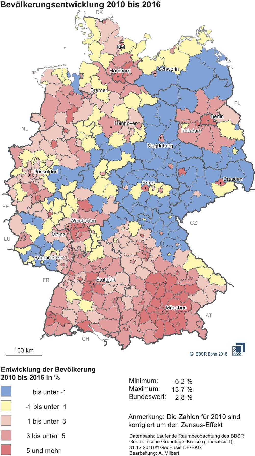 Die Bevölkerungsentwicklung in Deutschland verläuft regional sehr unterschiedlich. Der generelle Trend: Die Metropolen und ihr Umland wachsen, die schwach besiedelten Regionen verlieren weiter. Das stellte jetzt das Bundesinstitut für Bau-, Stadt- und Raumforschung (BBSR) in einer neuen Studie fest.