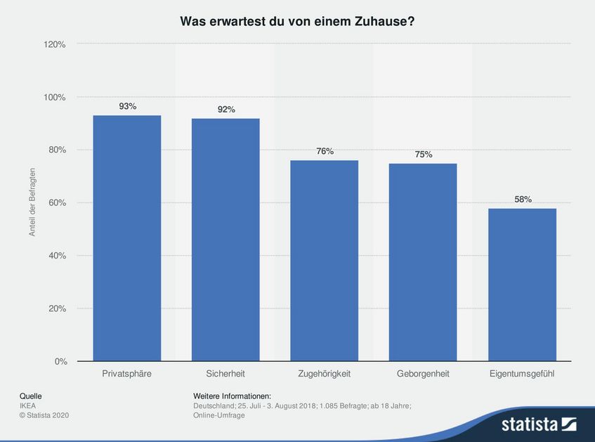 So ergab eine Umfrage des Marktforschungsinstituts Appinio im Jahr 2019 in Deutschland, Österreich und der Schweiz, dass sich 57 Prozent der Befragten Behaglichkeit und ein gutes Wohngefühl wünschen. Laut einer Statistik im Auftrag des schwedischen Möbelhauses IKEA aus dem Jahr 2018 ist für rund 93 Prozent der Bundesbürger:innen in ihrem Zuhause zuerst Privatsphäre wichtig. Auf dem zweiten Platz der wichtigsten Bedürfnisse lag mit 92 Prozent die Sicherheit. Rund drei Viertel erwarten vom Zuhause Zugehörigkeit und Geborgenheit.