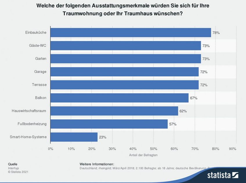 Bei der Innenausstattung legten 78 Prozent der vom Immobilienfinanzierer Interhyp im Jahr 2018 Befragten Wert auf eine Einbauküche, 73 Prozent hätten gern ein Gäste-WC, für 62 Prozent ist ein Hauswirtschaftsraum wichtig und für 57 Prozent eine Fußbodenheizung. Smart-Home-Systeme zur automatischen Steuerung etwa von Rollläden, Licht oder Kühlschranktemperatur setzten 2018 erst 23 Prozent der Befragten auf die Ausstattungswunschliste.