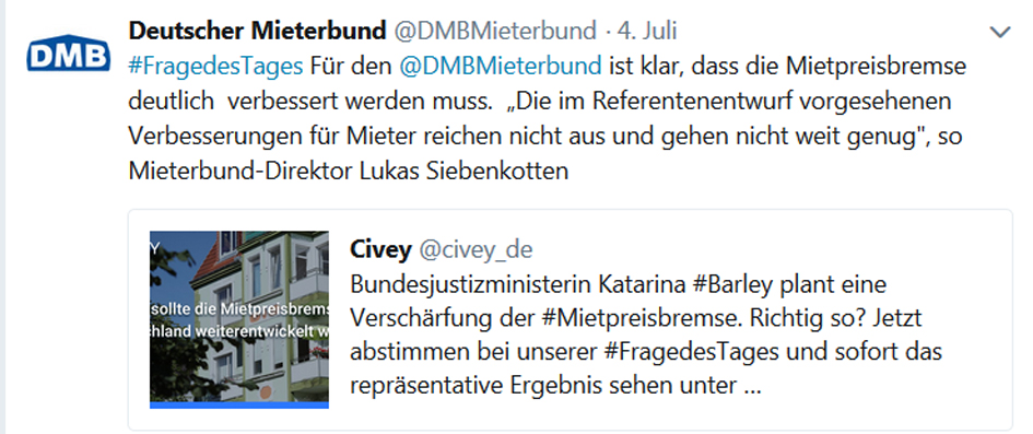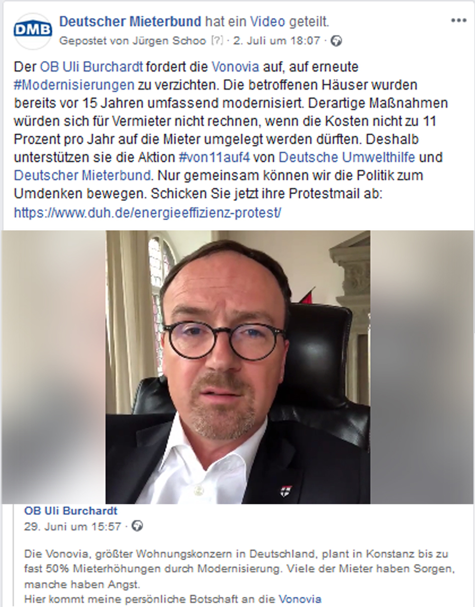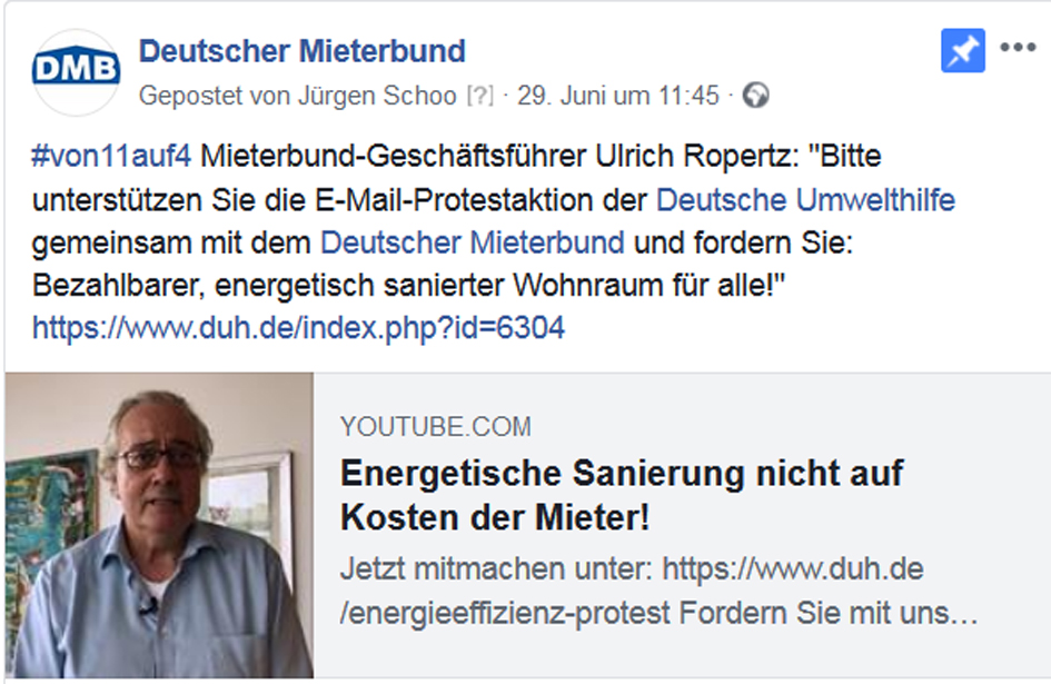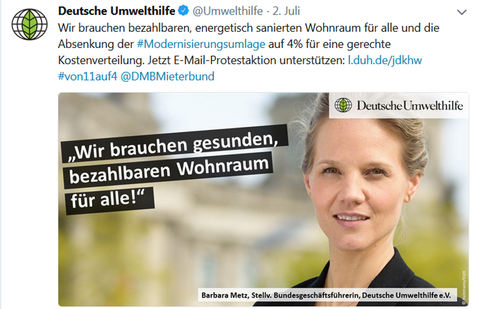 Die Koalition zwischen CDU/CSU und SPD kann sich bislang nicht auf eine deutliche Einschränkung der Mietpreiserhöhungsspielräume nach einer Modernisierung einigen. Bundesjustizministerin Dr. Katarina Barley hat bei der Modernisierungsumlage eine Absenkung von elf auf acht Prozent vorgeschlagen. Der Deutsche Mieterbund fordert gemeinsam mit der Deutschen Umwelthilfe eine wesentlich deutlichere Absenkung, nämlich #von11auf4. Bitte unterstützen sie die Protestaktion unter: https://www.duh.de/index.php?id=6304