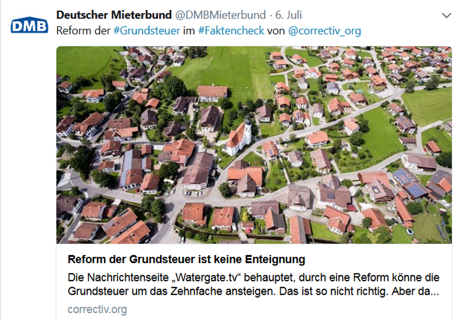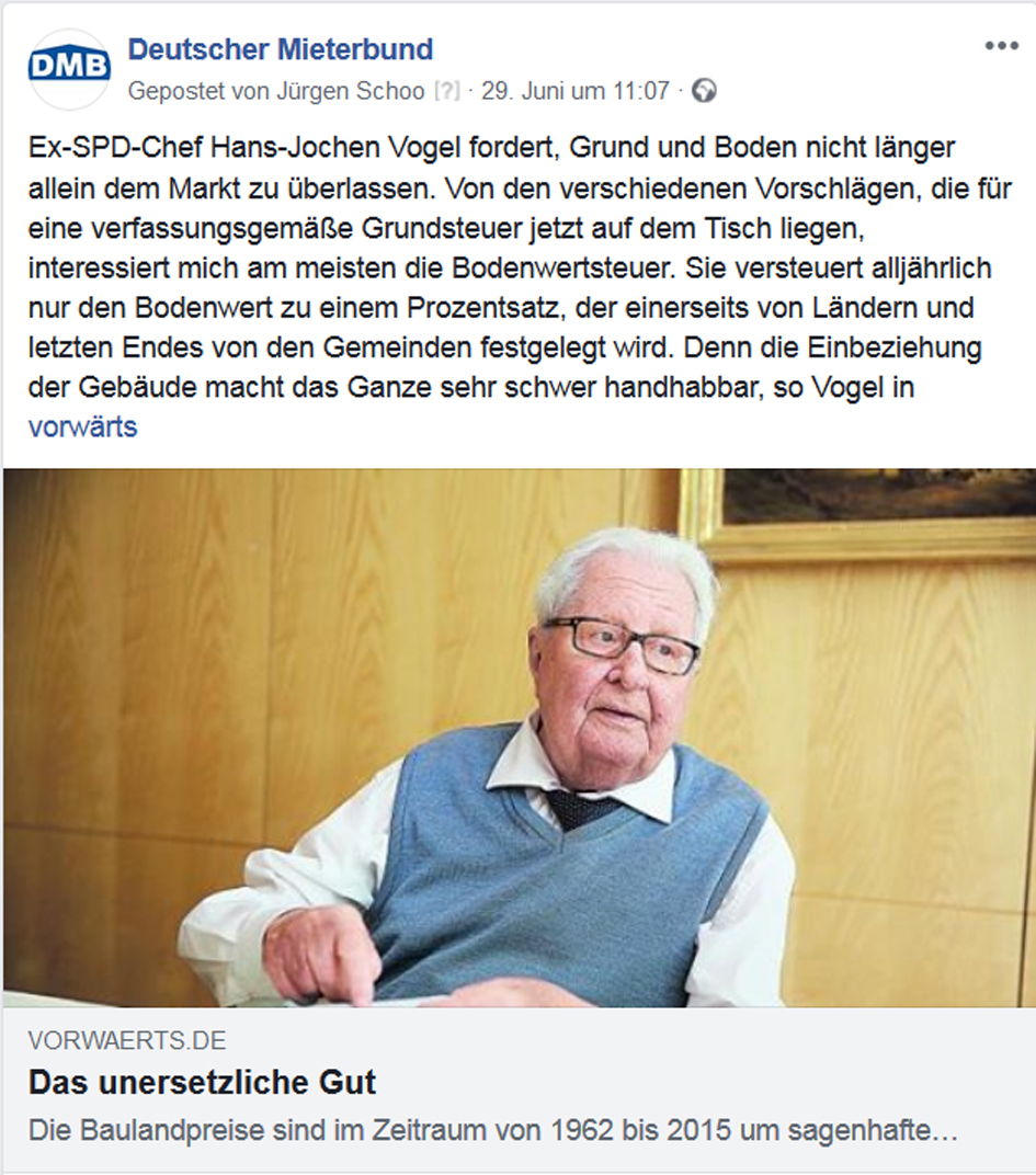 Bei der anstehenden Reform der Grundsteuer empfiehlt der Deutsche Mieterbund, die Steuer auf den Bodenwert abzustellen. Interessante Beiträge zur Diskussion liefern Ex-SPD-Chef Hans-Jochen Vogel und die Journalisten-Plattform correctiv.org. Weitere Diskussionsbeiträge und Informationen finden Sie unter: https://www.facebook.com/DMBMieterbund/ und https://twitter.com/DMBMieterbund