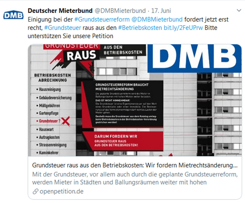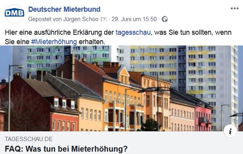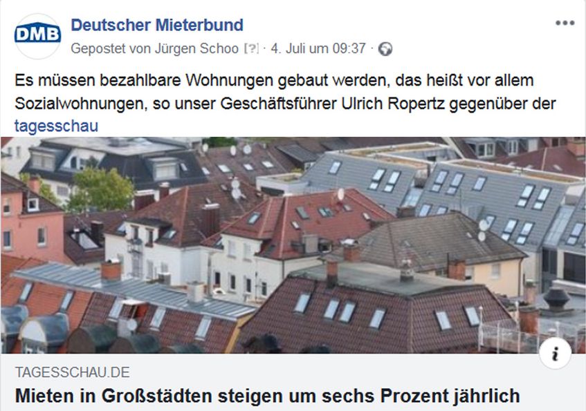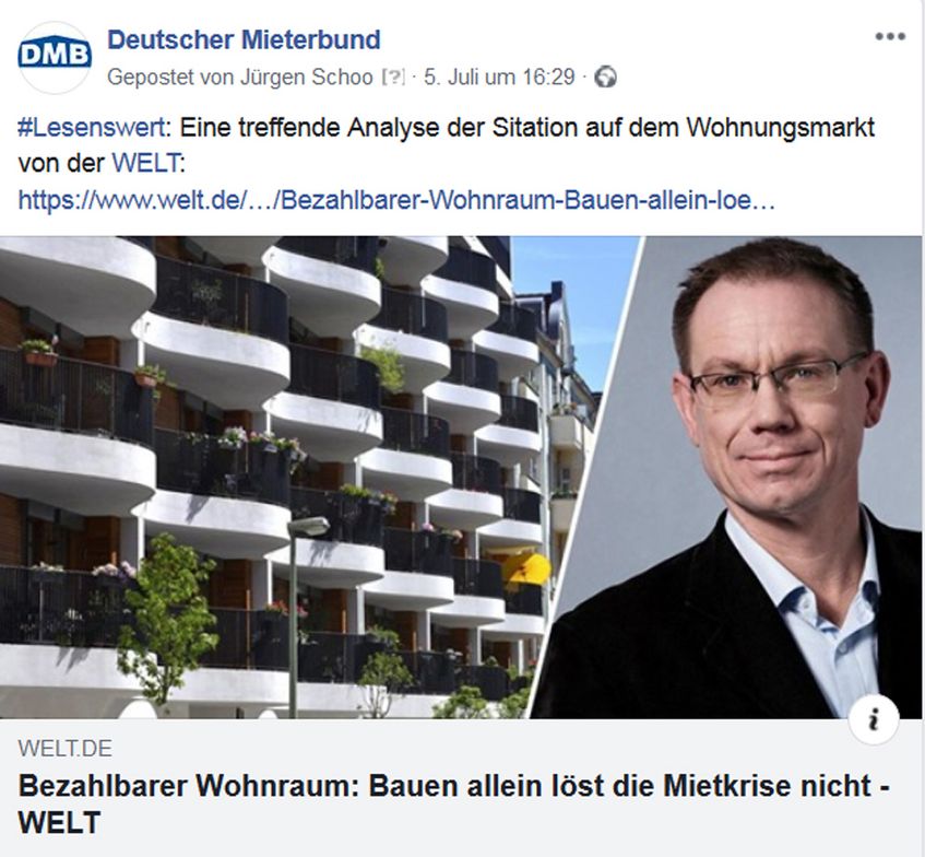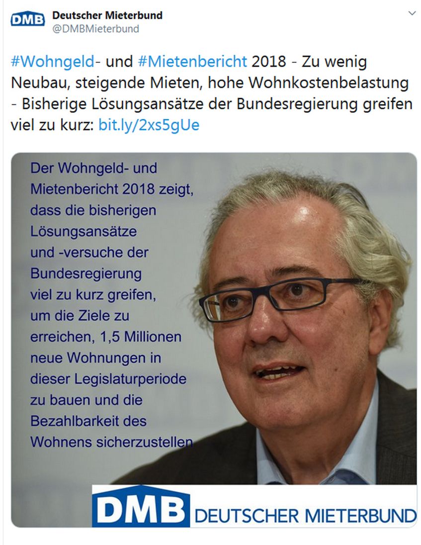 Zahlen zum Wohnungsmarkt und Lösungsansätze zu den Problemen, darum ging es auch auf unseren Social-Media-Seiten. Der jetzt vorgelegte Wohngeld- und Mietenbericht 2018 legt die Hilflosigkeit der Politik offen. Nervöse Politiker interpretieren Aussagen des Mieterbundes bewusst falsch. Wer die Lösung der Probleme allein im Neubau sucht, sei denkfaul, so Michael Fabricius von der Welt in seinem lesenswerten Kommentar. Aktuelle Informationen finden Sie unter https://www.facebook.com/DMBMieterbund/ und https://twitter.com/DMBMieterbund