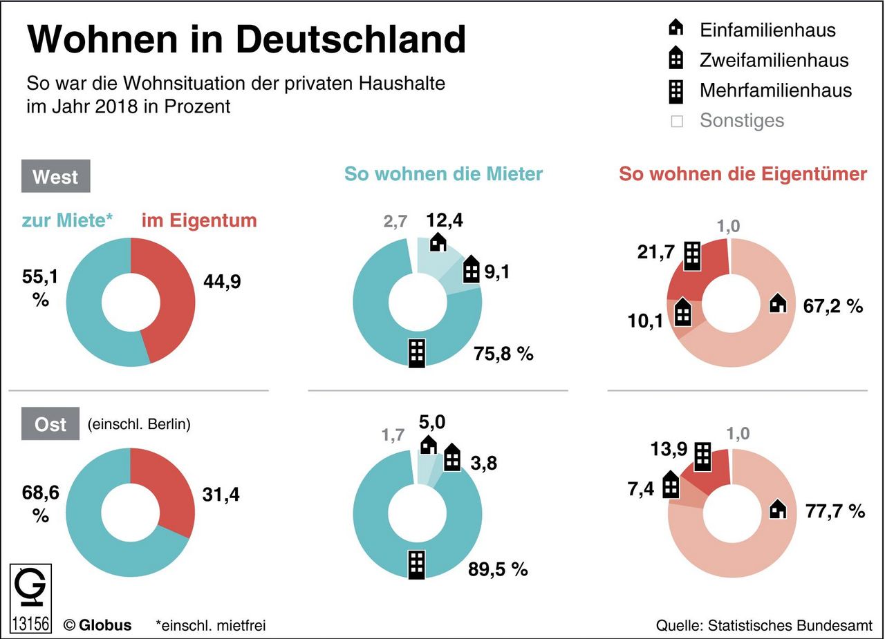 Beim Thema Wohnen und Mieten lassen sich 30 Jahre nach der Wende weiter große Unterschiede zwischen West und Ost beobachten. So ist in Ostdeutschland der Anteil der Mieterhaushalte an der Gesamtzahl der Haushalte deutlich höher als im Westen. Das geht aus Zahlen des Statistischen Bundesamtes hervor. Demnach wohnen in Ostdeutschland (einschließlich Berlin) fast 69 Prozent der Haushalte zur Miete, in Westdeutschland sind es dagegen nur rund 55 Prozent. 30 Jahre nach der Wende macht sich damit weiter bemerkbar, dass in der DDR weniger gekauft und gebaut wurde als in der BRD.