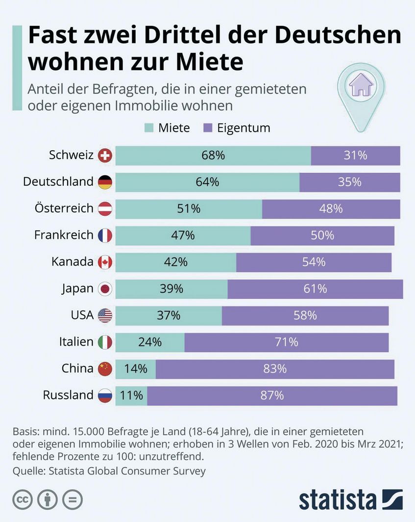 Deutschland bleibt das Land der Mieter:innen. 64 Prozent der Menschen hierzulande leben in einer gemieteten Wohnung, weltweit sind es nur in der Schweiz (68 Prozent) noch mehr. Das zeigt die hier dargestellte Grafik auf Basis von Daten des Statista Global Consumer Survey. Auch in Österreich lebt mehr als die Hälfte der Einwohner:innen zur Miete, in den meisten anderen Ländern sind es deutlich weniger.