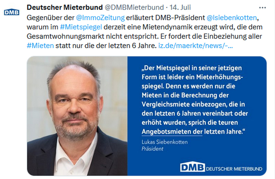 Begrüßenswert ist, dass der Bundesgerichtshof Mieter:innen mehr Zeit einräumt, Auskunft von ihren Vermietenden über die Berechnungsgrundlage des Mietpreises und eventuelle Ausnahmetatbestände der Mietpreisbremse zu fordern. Um den Mietenanstieg zu bremsen, fordert DMB-Präsident Lukas Siebenkotten, alle Mieten in den Mietspiegel einzubeziehen und nicht nur die der vergangenen sechs Jahre.