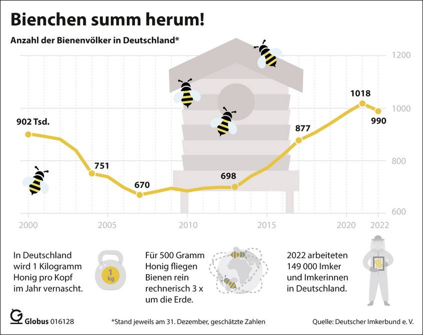 In den vergangenen Jahren haben immer mehr Menschen ihre Liebe zur Bienenhaltung entdeckt, so gibt es auch in größeren Städten immer mehr Bienenstöcke auf Dächern, Balkons oder in Gärten und Kleingärten. Nachdem sich die Anzahl der Bienenvölker in Deutschland seit dem Jahr 2000 zunächst reduziert hatte, lag sie daher Ende 2021 zum ersten Mal seit 1996 wieder bei über einer Million. Zum Jahresende 2022 ging ihre Anzahl dann wieder auf rund 990.000 zurück. Jedes Bienenvolk kann laut dem Imkerbund durchschnittlich 20 bis 30 Kilogramm Honig pro Jahr produzieren.