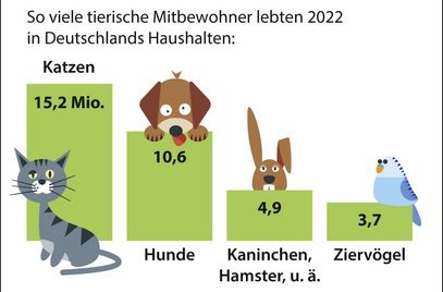 Das beliebteste Haustier bleibt wie in den Vorjahren die Katze: 15,2 Millionen „Sofatiger“ wurden 2022 in Deutschland gezählt, nahezu in jedem vierten Haushalt lebte laut Zahlen des Industrieverbands Heimtierbedarf und des Zentralverbands Zoologischer Fachbetriebe Deutschlands eine Katze. Auch europaweit führen Katzen die Beliebtheitsliste an. Zweitliebstes Haustier der Deutschen ist der Hund (10,6 Millionen).
