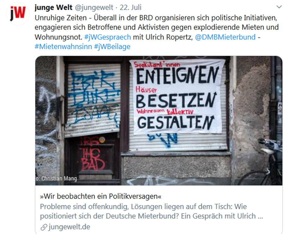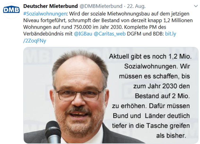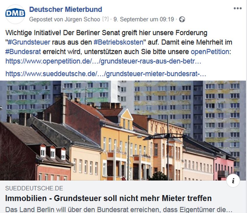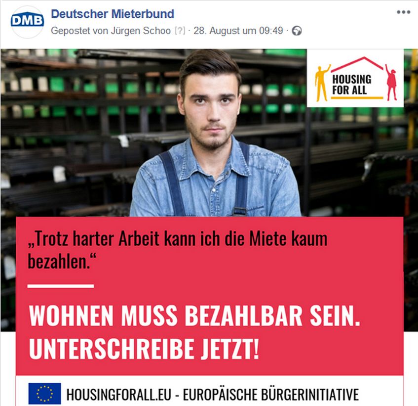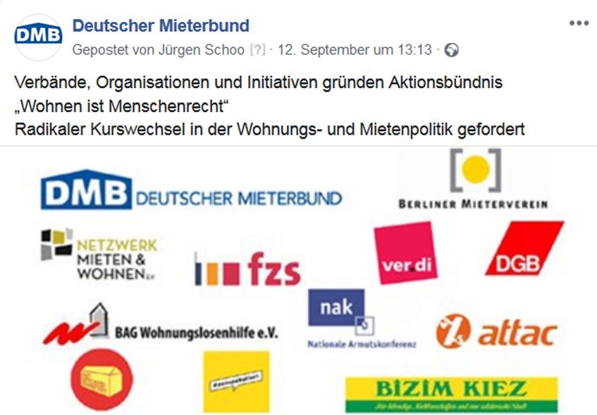 Gemeinsam mit anderen Verbänden, Organisationen und Initiativen setzt sich der Deutsche Mieterbund dafür ein, dass Wohnen als Menschenrecht akzeptiert wird. Damit Wohnen auch in Zukunft bezahlbar ist, muss es genügend Sozialwohnungen geben. Außerdem dürfen die Nebenkosten nicht überfrachtet werden. Die Grundsteuer sollte nicht mehr auf die Mieter abgewälzt werden können, zur Erreichung der Klimaziele müssen ausreichend Fördermittel zur Verfügung gestellt werden. Aktuelle Informationen zu unseren Forderungen finden Sie unter https://www.facebook.com/DMBMieterbund/ und https://twitter.com/DMBMieterbund