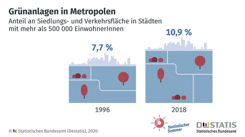 In Städten mit Einwohnerzahlen zwischen 250.000 und 500.000 gibt es einen ähnlichen Trend: Hier stieg der Anteil der Grünflächen von 1996 bis 2018 um 2,6 Prozentpunkte auf 9,7 Prozent. Pro Kopf stehen den Einwohnern hier 27 Quadratmeter Grünfläche zur Verfügung. „Insgesamt lässt sich aus der Entwicklung ableiten, welch hohe Bedeutung den Funktionen von Grünflächen im urbanen Raum beigemessen wird“, teilte das Bundesamt mit.