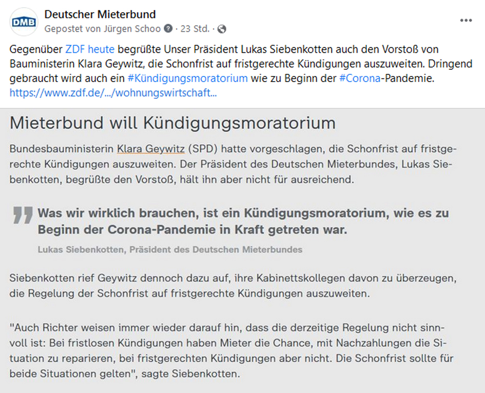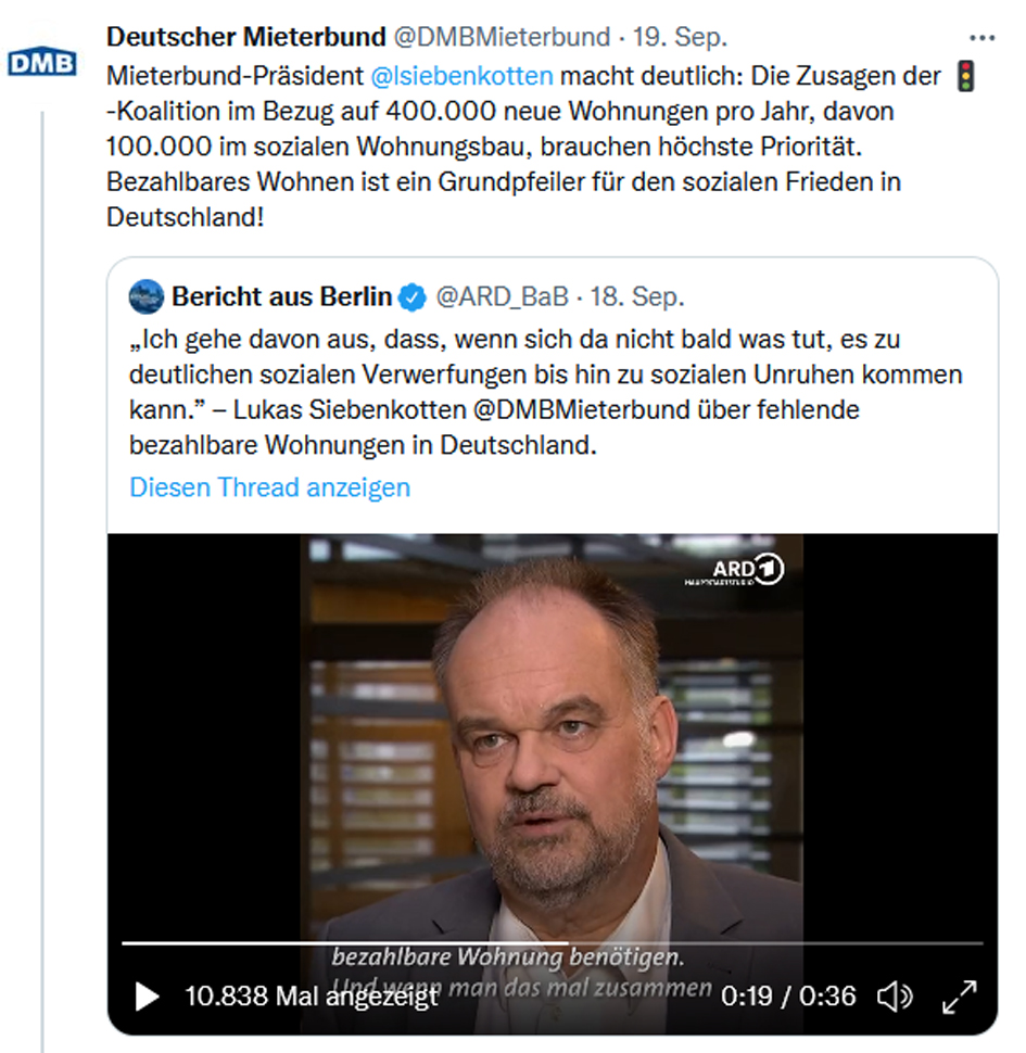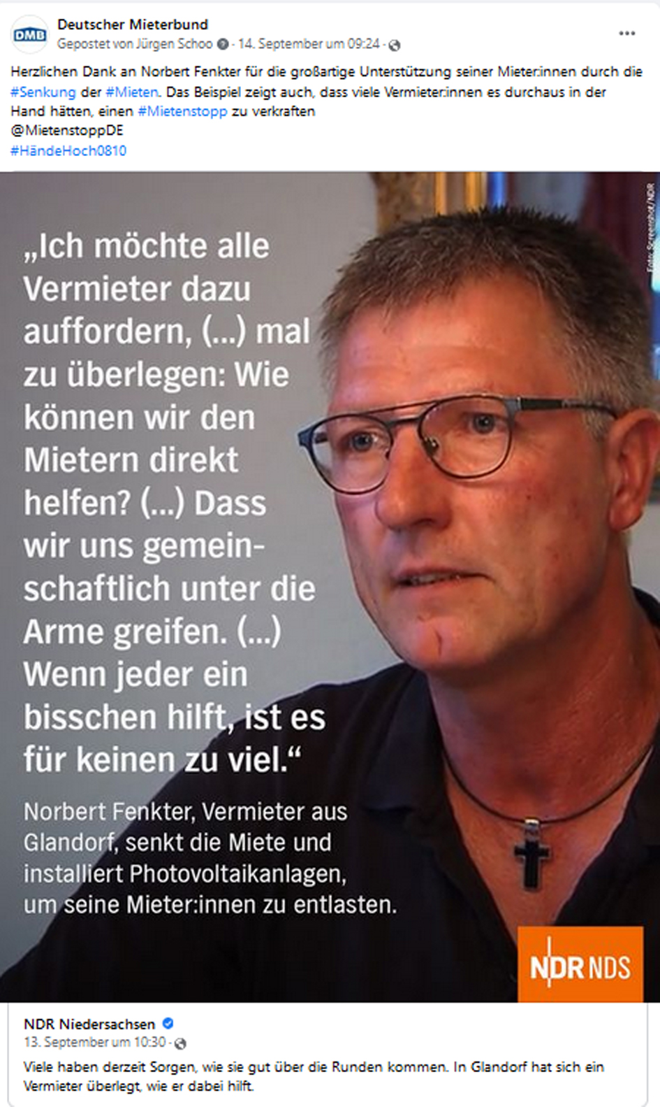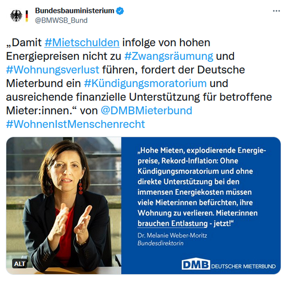 Zum Tag der Wohnungslosen am 11. September beteiligte sich der Deutsche Mieterbund an der Twitter-Aktion des Bundesbauministeriums: Unsere Bundesdirektorin Dr. Melanie Weber-Moritz warnte, dass Mieter:innen Wohnungslosigkeit droht, wenn sie aufgrund der hohen Energiekosten ihre Miete nicht mehr bezahlen können. Unser Präsident Lukas Siebenkotten macht sich deshalb für ein Kündigungsmoratorium, ähnlich dem zu Beginn der Coronapandemie, stark. Mit dem Verbändebündnis Soziales Wohnen forderte er, dass der Neubau von 400.000 Wohnungen, davon 100.000 im sozialen Wohnungsbau, trotz der schwierigen Zeiten dringend vorangetrieben werden muss. Ausdrücklich dankt der Mieterbund sozial eingestellten Vermietern wie Norbert Fenkter, die ihre Mieter:innen durch eine Kürzung der Miete unterstützen.