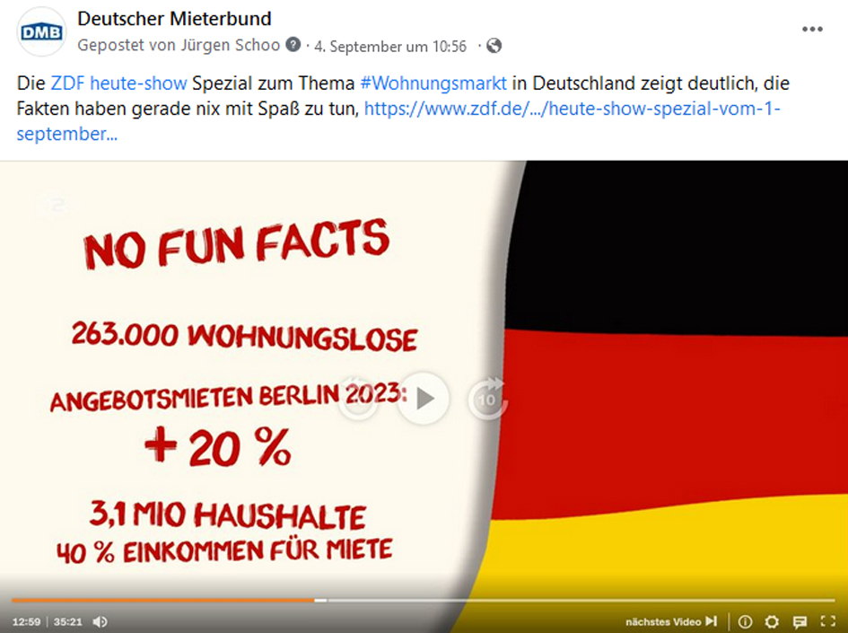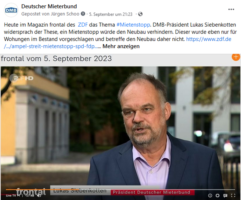 Die ZDF heute-show brachte es in ihrer Sendung vom 1. September 2023 auf den Punkt: Die Fakten am Wohnungsmarkt haben gerade nix mit Spaß zu tun. Im Magazin frontal erklärte Mieterbund-Präsident Lukas Siebenkotten, jetzt könne nur noch ein Mietenstopp helfen. Dieser würde auch den Wohnungsbau nicht ausbremsen, da der Neubau von einer solchen Regelung nicht betroffen sei.