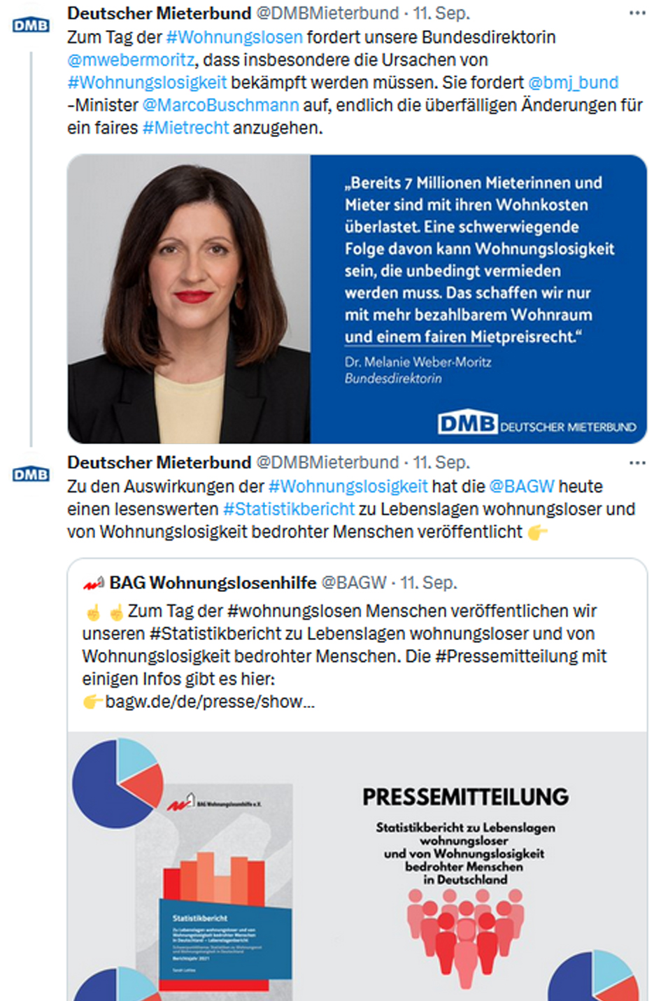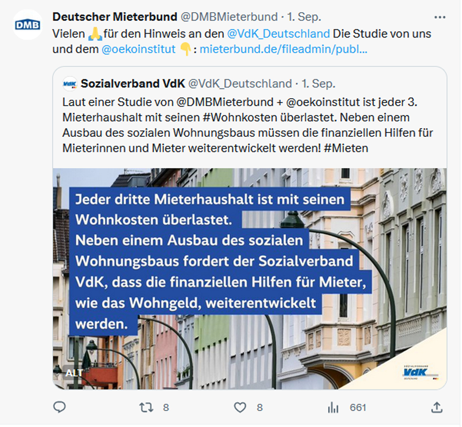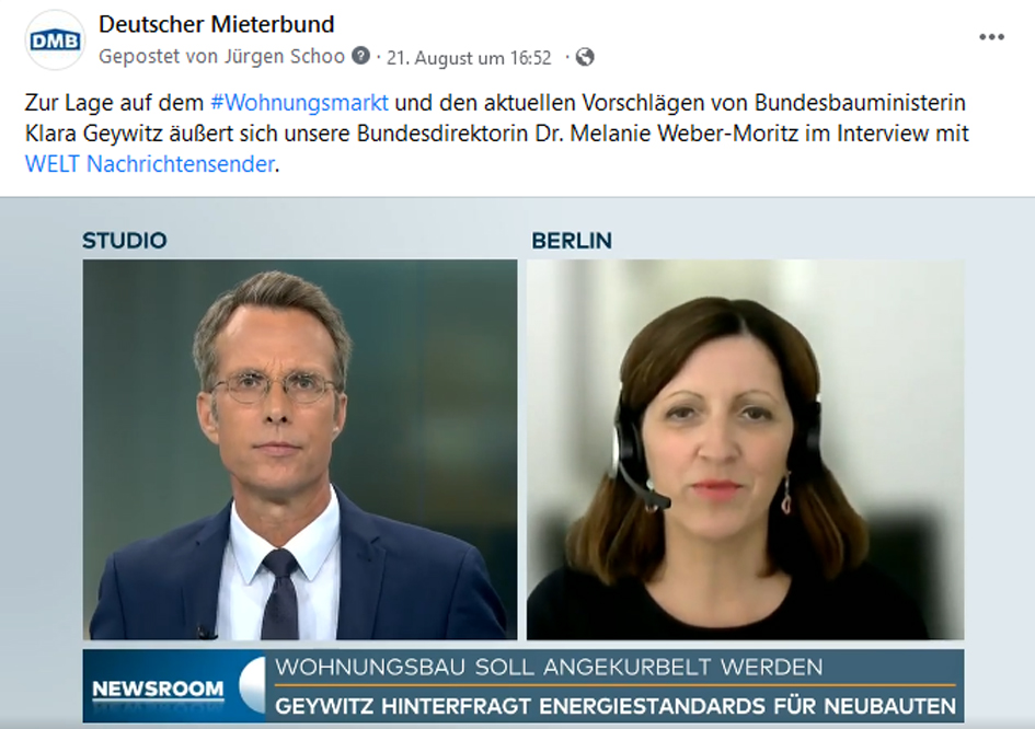 Bei Welt-TV wiederholte Bundesdirektorin Dr. Melanie Weber-Moritz den Vorschlag des Mieterbundes nach einem Sondervermögen in Höhe von 50 Milliarden Euro für den Wohnungsbau. Eine Absenkung der Energiestandards sei dagegen nicht hilfreich, weil dann später höhere Wohnkosten auf die Mieter:innen zukommen würden. Gemeinsam mit anderen Sozialverbänden wie dem VdK oder der BAG-Wohnungslosenhilfe weisen wir regelmäßig auf die finanzielle Überlastung vieler Menschen durch Wohnkosten und dadurch drohende Wohnungslosigkeit hin.