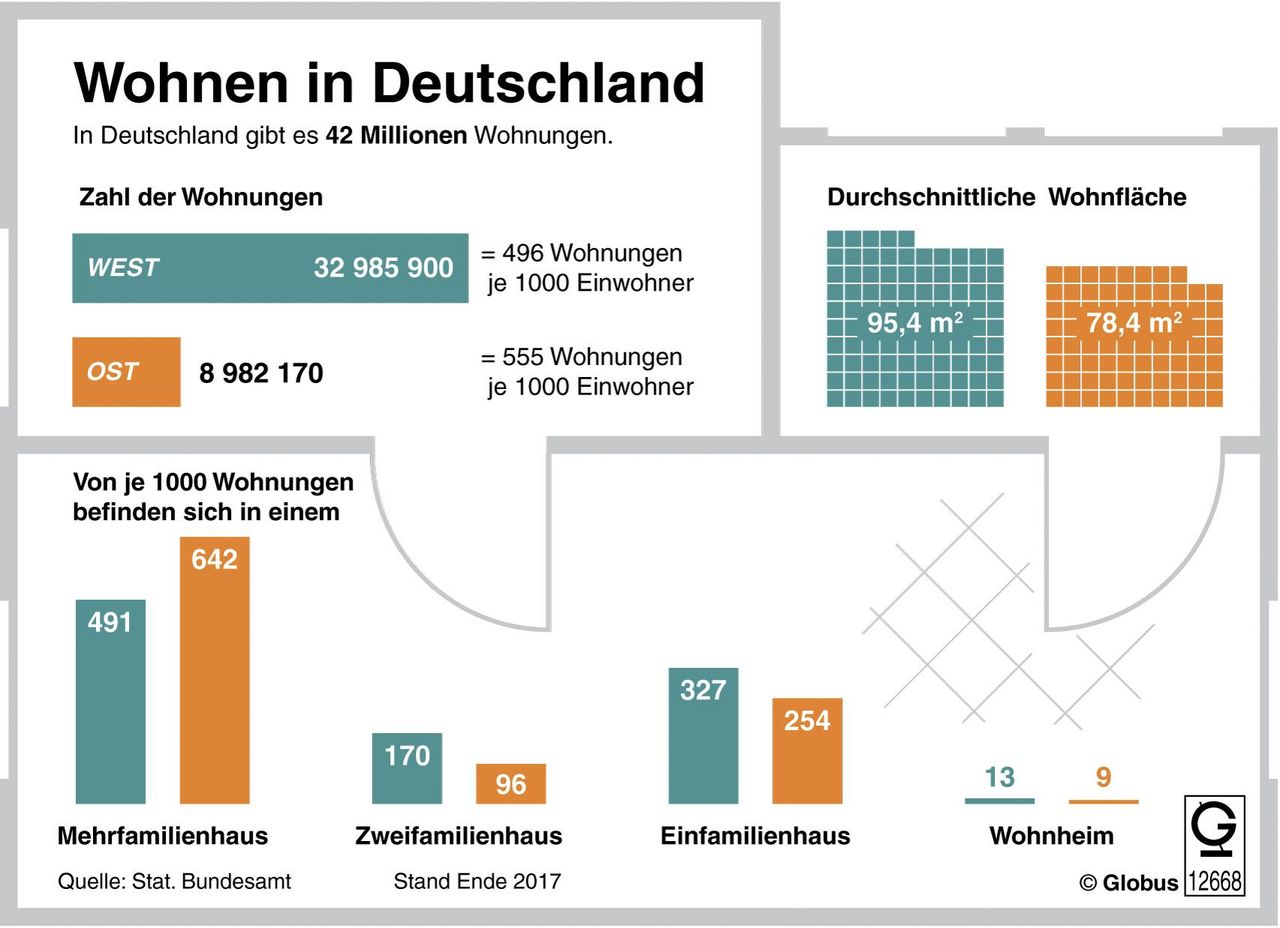 Das Statistische Bundesamt (Destatis) ermittelte zum 31. Dezember 2017 rund 42 Millionen Wohnungen. Davon befanden sich 33 Millionen in den westlichen und neun Millionen in den östlichen Bundesländern. Damit entfallen auf je 1.000 Einwohner 507 Wohnungen (im Westen 496, im Osten 555). Zur Jahrtausendwende zählten die Statistiker in Deutschland knapp 38 Millionen Wohnungen, im Westen waren es 30,5 Millionen, im Osten 7,5 Millionen.
