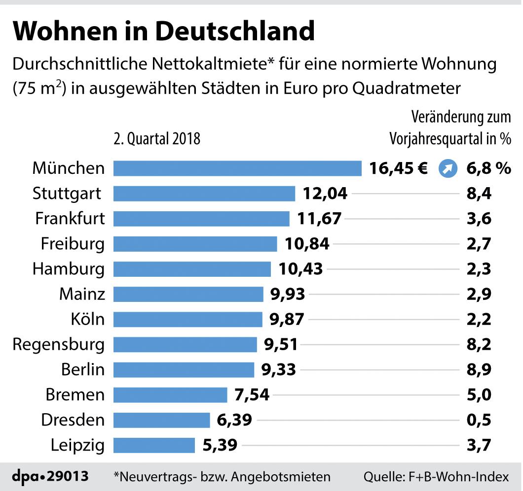 Für 2017 errechnete das F+B-Institut in Hamburg einen durchschnittlichen Quadratmeterpreis in Städten, die einen Mietspiegel hatten, von 6,72 Euro kalt. In ländlichen Räumen, in vielen ostdeutschen Regionen liegen die Durchschnittsmieten darunter. In Großstädten aber deutlich darüber. In München werden etwa 10,22 Euro je Quadratmeter fällig, in Stuttgart 9,92 Euro und in Köln 8,43 Euro. Deutlich teurer sind die Neuvertrags- und Angebotsmieten. In München haben sie mittlerweile die schwindelerregende Höhe von 16,45 Euro erreicht. In Köln sind bei einer Neuanmietung gut 9,87 Euro im Schnitt fällig, in Stuttgart sind es 12,04 Euro je Quadratmeter kalt.
