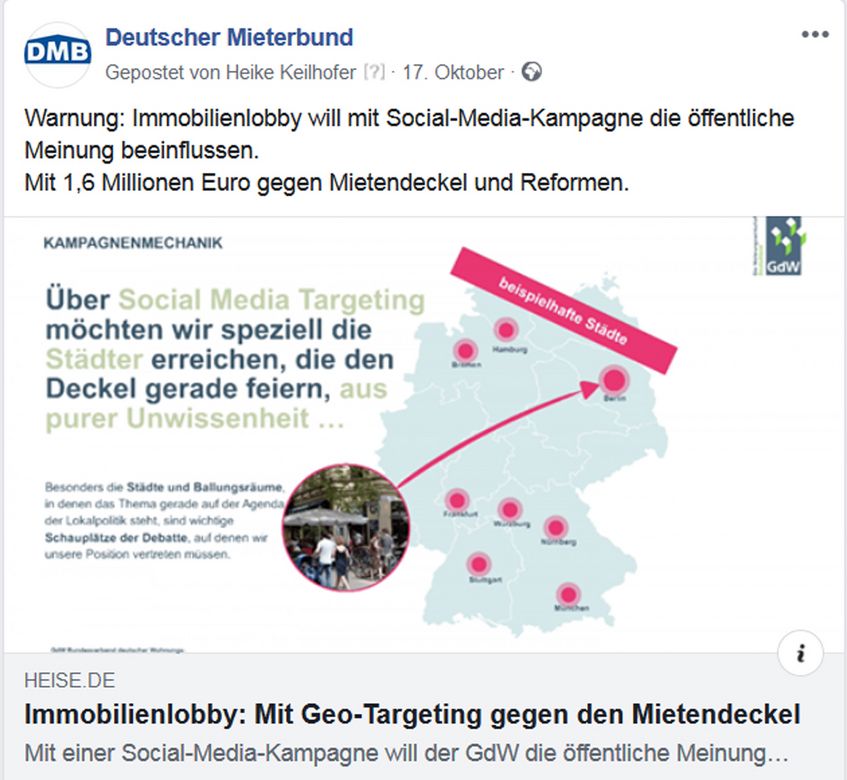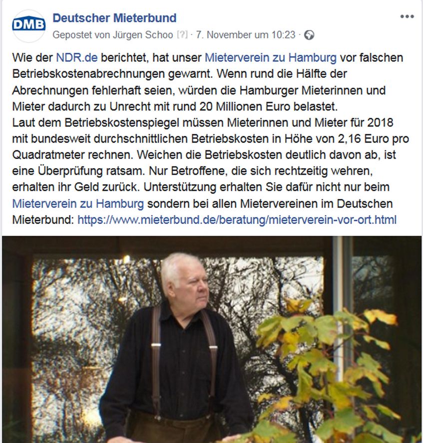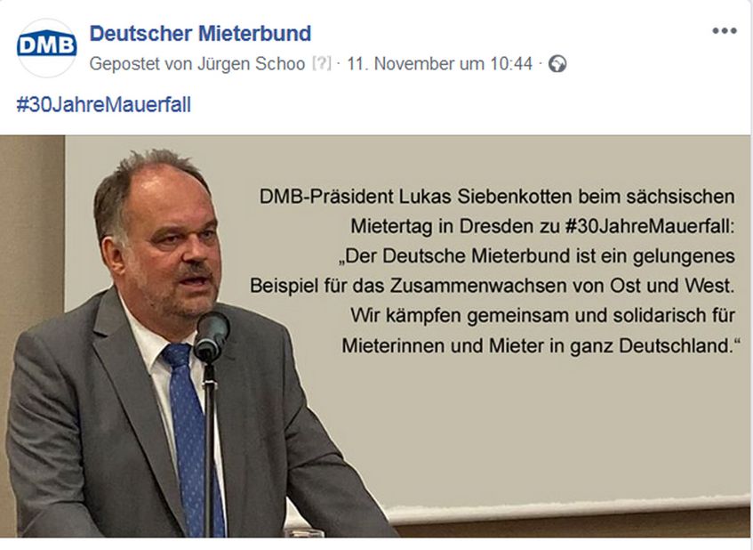Erfreuliches konnte Mieterbund-Präsident Lukas Siebenkotten auf dem sächsischen Mietertag in Dresden berichten: „30 Jahre nach dem Mauerfall ist der Deutsche Mieterbund ein gelungenes Beispiel für das Zusammenwachsen von Ost und West.“ Sonderbar finden wir dagegen die Aktion des GdW Bundesverband deutscher Wohnungs- und Immobilienunternehmen, der sich mittels Geo-Targeting gegen den Mietendeckel wehren will. Die Mitgliedsunternehmen sollen dafür rund 1,8 Millionen Euro zur Verfügung stellen. Erstaunlich ist auch der Vergleich der durchschnittlichen Betriebskosten bei der Vonovia mit den Höchstwerten des DMB-Betriebskostenspiegels. Vielleicht aber auch nicht, wenn man bedenkt, dass diese Firma etwa in Hamburg auch gerne die Kontrolle nicht existenter Waschmaschinen in Rechnung stellt. Aktuelle Informationen finden Sie wie immer unter https://www.facebook.com/DMBMieterbund/ und https://twitter.com/DMBMieterbund