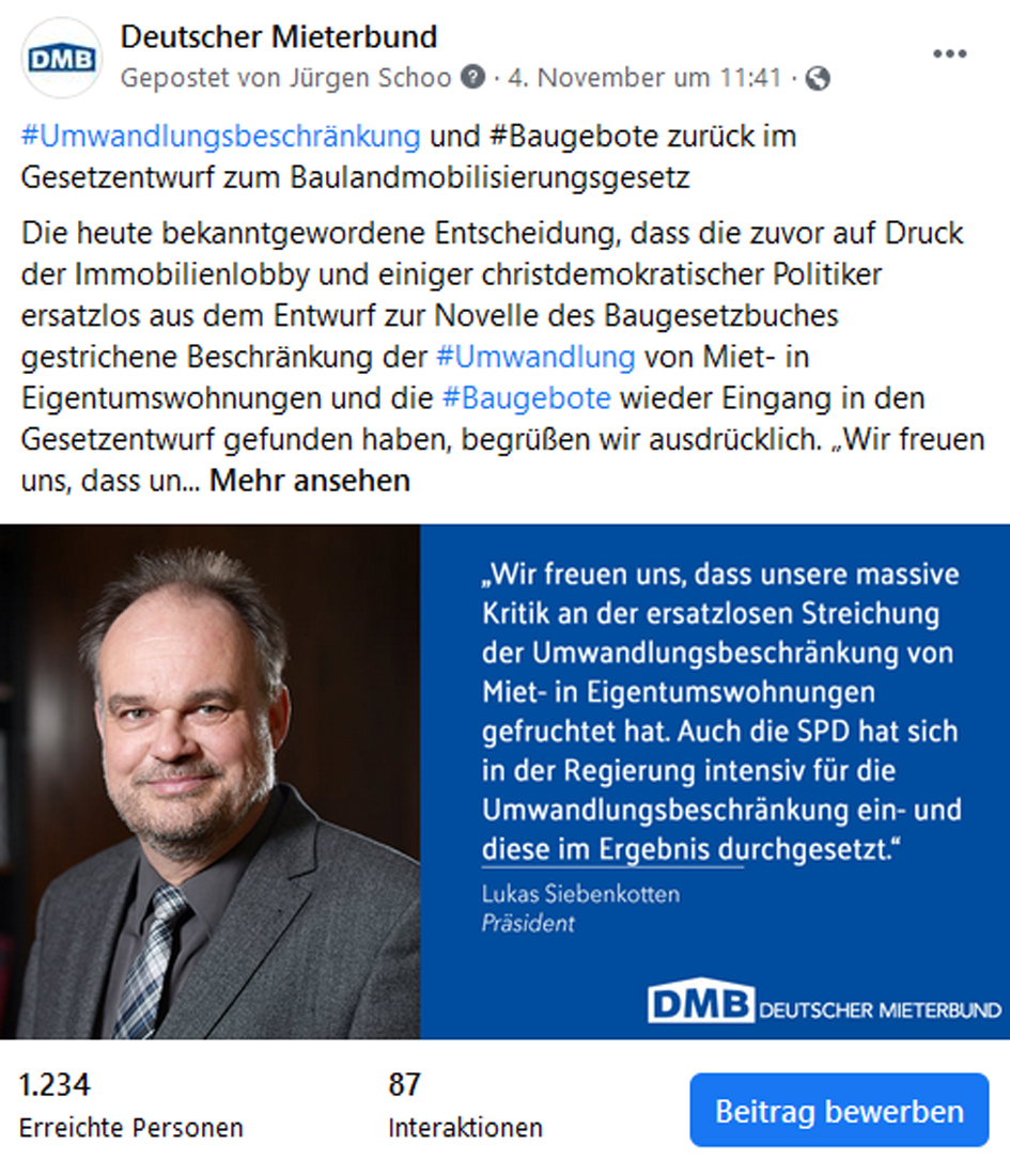 Die Wohnungssuche wird für Mieter insbesondere in größeren Städten immer schwieriger. Das liegt auch daran, dass immer mehr Mietwohnungen in Eigentumswohnungen umgewandelt werden. Deshalb stand schon im Ergebnispapier des Wohngipfels 2018: „Der Bund strebt an, unter Einbeziehung von Ländern und Kommunen die Möglichkeiten zu reduzieren, Mietwohnungen in Eigentumswohnungen umzuwandeln.“ Wir setzen uns energisch dafür ein, dass die Umwandlungsbeschränkung gegen die Wünsche der Immobilienwirtschaft umgesetzt wird. Bei der grundsätzlich sinnvollen CO2-Bepreisung fordern wir, dass derjenige die Zusatzkosten tragen soll, der es in der Hand hat, eine umweltfreundlichere Technik in die Mietwohnung einzubauen.