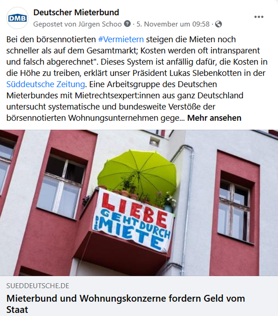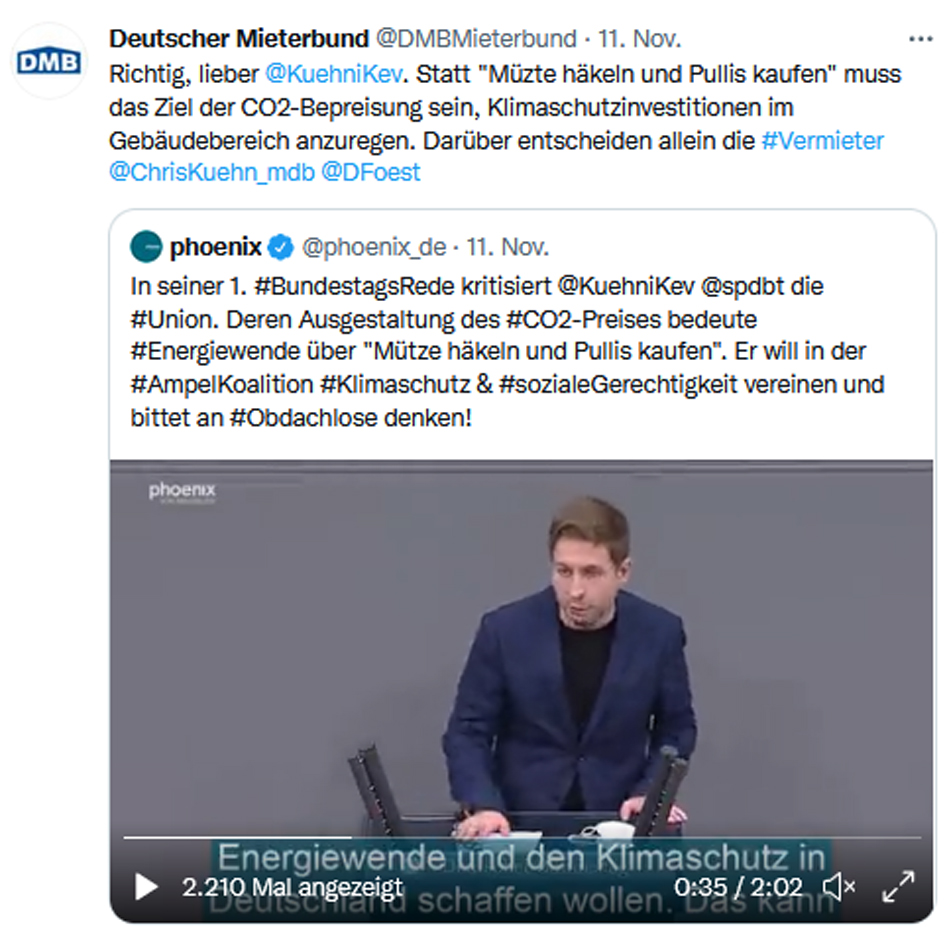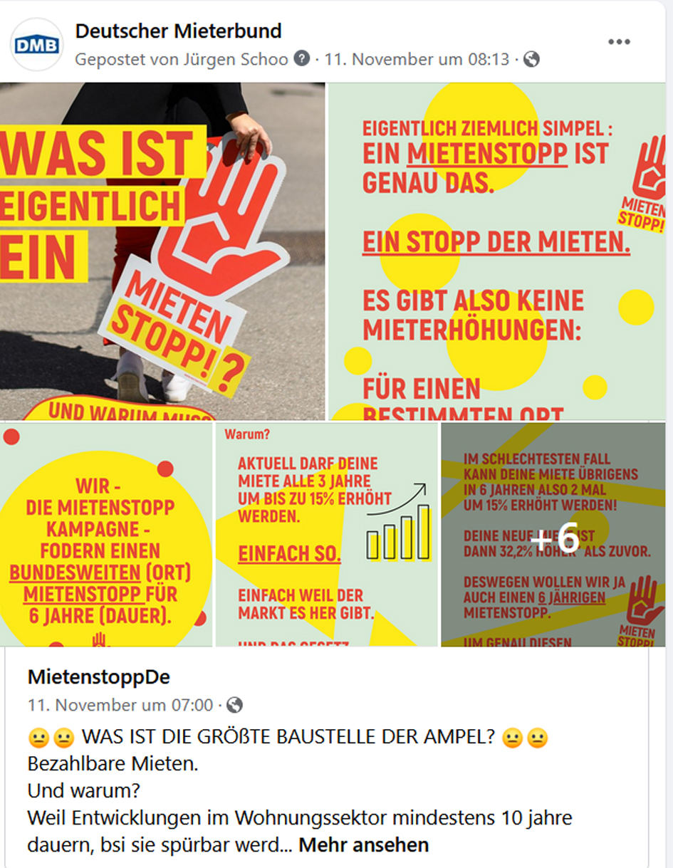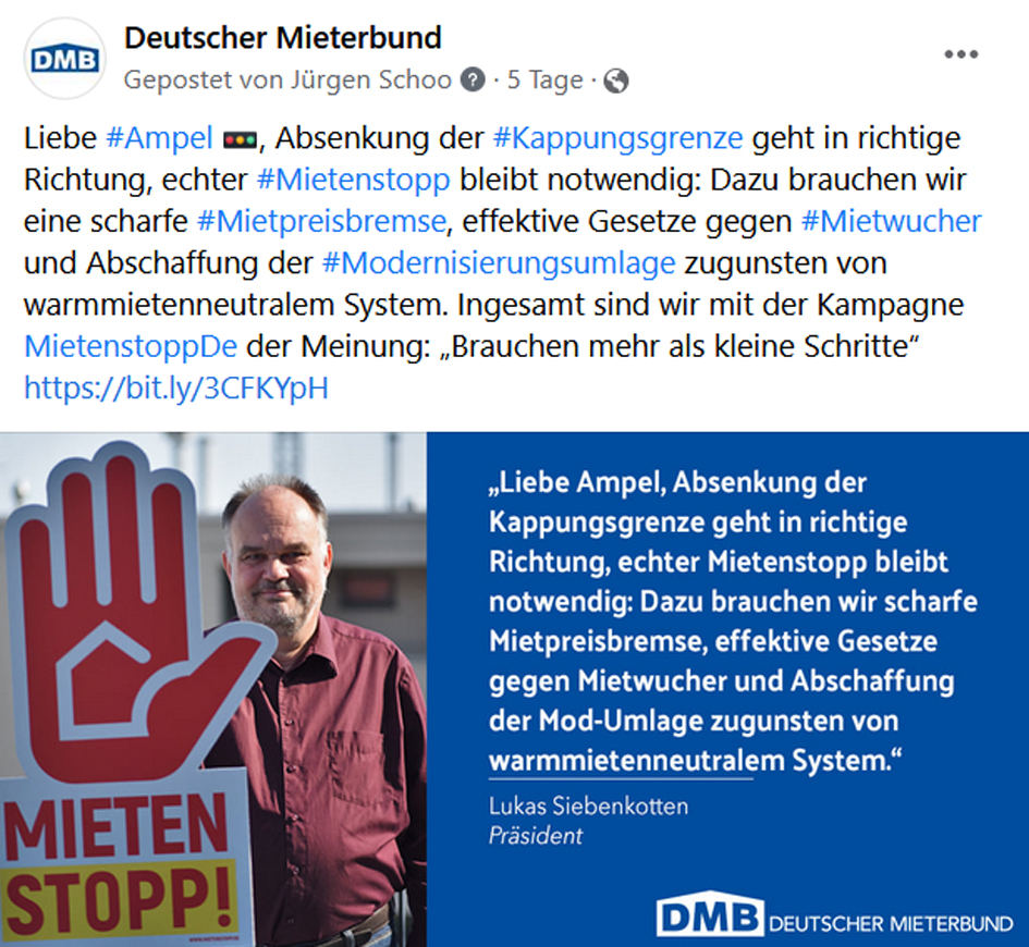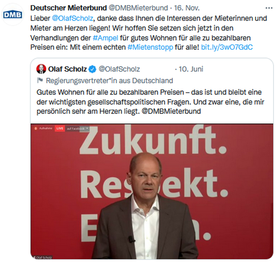 Auch nach der Bundestagswahl lassen wir nicht nach, für die Interessen von Mieterinnen und Mietern zu werben. So haben wir den künftigen Bundeskanzler Olaf Scholz daran erinnert, dass ihm diese laut eigener Wahlkampfaussage am Herzen liegen, und Kevin Kühnert darin bestärkt, dass der CO2-Preis bei den Heizkosten nicht allein von Mieterinnen und Mietern getragen werden darf. Mit unseren Bündnispartnern der „Kampagne Mietenstopp” fordern wir von den Koalitionären einen Mietenstopp. In anschaulichen Bildern erklären wir, was wir uns darunter vorstellen und warum eine abgesenkte Kappungsgrenze nicht reicht. Gleichzeitig werben wir dafür, dass nicht auch noch die Kosten für energetische Sanierungen auf die Mieter:innen abgeladen werden dürfen.