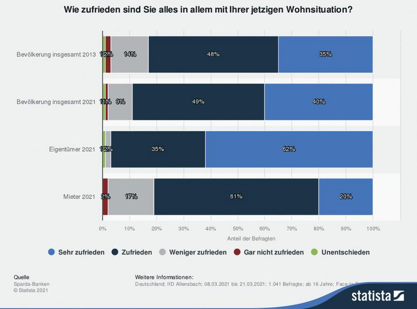Mieter:innen sind im Schnitt deutlich unzufriedener mit ihrer aktuellen Wohnsituation als Eigentümer:innen. Das zeigen die Ergebnisse einer Studie des Allensbach-Institutes im Auftrag der Sparda-Bank vom März 2021. Demnach sind 97 Prozent aller Haus- oder Wohnungseigentümer:innen zufrieden (35 Prozent) oder sogar sehr zufrieden (61 Prozent). Bei den Mieter:innen sind dagegen insgesamt nur 81 Prozent mit ihrer Wohnsituation zufrieden (61 Prozent) oder gar sehr zufrieden (20 Prozent). 19 Prozent der Bewohner:innen einer Mietwohnung sagten, sie seien weniger oder gar nicht damit zufrieden, wie sie wohnten.