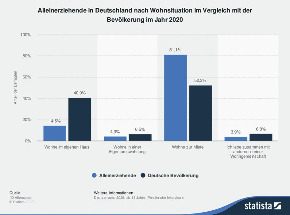 Dagegen gaben 23,3 Prozent derjenigen mit einem niedrigeren Einkommen (unter 2.500 Euro) an, sich Sorgen oder sogar große Sorgen um ihre zukünftige Wohnsituation zu machen. In dieser Gruppe besitzen weniger Personen Wohneigentum, je niedriger das Einkommen, desto weniger. So leben laut einer Allensbach-Umfrage aus dem vergangenen Jahr etwa 81,1 Prozent der Alleinerziehenden – die im Schnitt deutlich weniger Einkommen zur Verfügung haben als der Bevölkerungsdurchschnitt – zur Miete, in der Gesamtbevölkerung waren es rund 52,3 Prozent Mieter:innen. Auch andere Menschen mit geringen bis mittleren Einkommen wohnen häufiger in Mietwohnungen als im Eigentum – und sind damit offenbar grundsätzlich unzufriedener mit ihrer Wohnsituation (siehe erste Grafik).
