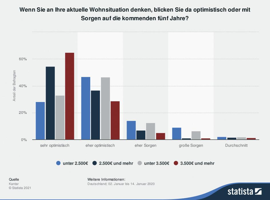 Ob die deutlich höhere Unzufriedenheit der Mieter:innen mit der schlechten Lage auf vielen Wohnungsmärkten und den niedrigen Einkommen in vielen Bevölkerungsgruppen zusammenhängt, wurde bei der Befragung nicht erfasst, es ist aber ein Zusammenhang zu vermuten: So betrachteten in einer Studie der BHW Bausparkasse zwei Drittel der Menschen mit einem Einkommen von 3.500 Euro und mehr ihre Wohnsituation in den kommenden fünf Jahren sehr oder eher optimistisch, Sorgen machten sich nur 6,1 Prozent. Da es in dieser Einkommensklasse deutlich mehr Immobilienbesitzer:innen als im Bevölkerungsdurchschnitt gibt, sind hier naturgemäß weniger Mieter:innen vertreten.