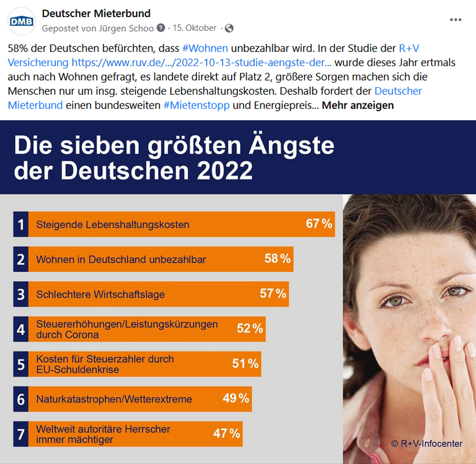58 Prozent der Deutschen befürchten, dass Wohnen unbezahlbar wird. In der Studie der R+V Versicherung wurde dieses Jahr erstmals auch nach Wohnen gefragt, das Themenfeld landete direkt auf dem zweiten Platz. Größere Sorgen machen sich die Menschen nur über die insgesamt steigenden Lebenshaltungskosten.