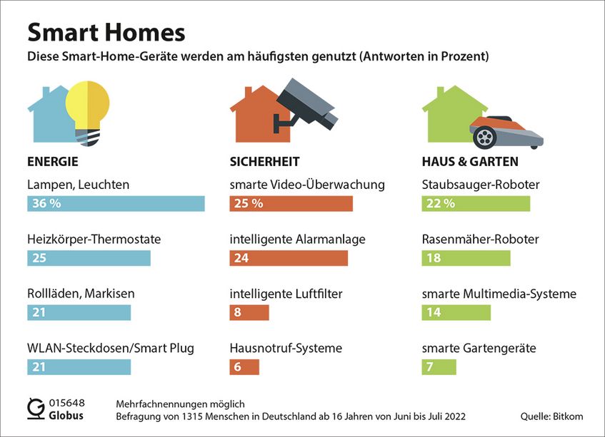 Die meistgenutzten Geräte sind derzeit intelligente Lampen und Leuchten, bei 36 Prozent der Befragten sind sie im Einsatz (2021: 29 Prozent). Sie können in Lichtfarbe, Helligkeit und Nutzungsdauer per App geregelt werden und so zum Energiesparen beitragen. Insgesamt nutzen 43 Prozent der Bundesbürger:innen mindestens eine Smart-Home-Anwendung in ihrer Wohnung oder ihrem Haus – 2018 waren es erst 26 Prozent.