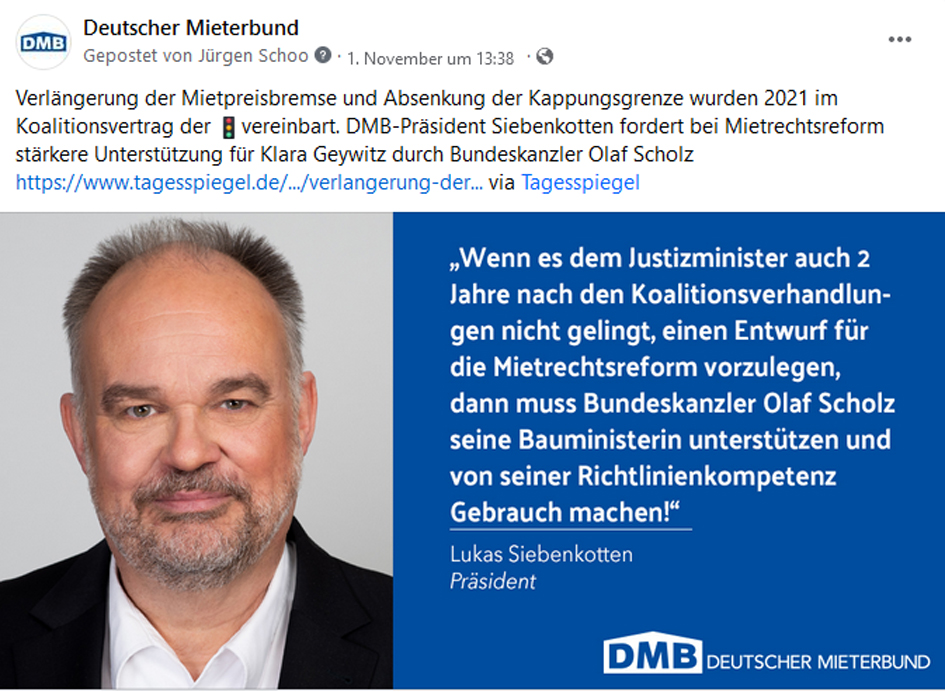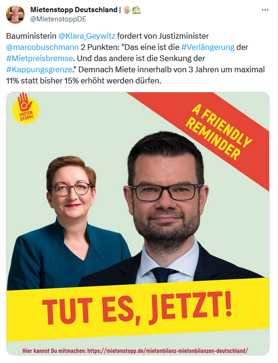 Zwei Jahre ist die Koalition aus SPD, BÜNDNIS 90/DIE GRÜNEN und FDP an der Regierung. Leider ist die Wohnungs- und Mietenpolitik in dieser Zeit nicht vorangekommen. Nicht einmal die im Koalitionsvertrag vereinbarten Änderungen im Mietrecht wurden umgesetzt. Nun will Bundeskanzler Olaf Scholz offenbar ein radikales Umdenken in der Baupolitik. „Zu einem Umdenken in der Bau- und Wohnungspolitik gehören auch die Einführung der neuen Wohngemeinnützigkeit, ausreichende Mittel für sozialen Wohnungsbau und ein Mietrecht, das Mietende ausreichend schützt“, erklärt DMB-Bundesdirektorin Dr. Melanie Weber-Moritz. Ein Sondervermögen für den Wohnungsbau, wie vom Verbändebündnis Soziales Wohnen gefordert, würde der momentan bedrängten Bauwirtschaft ebenso helfen wie Mieterinnen und Mietern mit schmalem Geldbeutel, erklärt Mieterbund-Präsident Lukas Siebenkotten. Mit dem Aktionsbündnis Mietenstopp fordert der Deutsche Mieterbund: TUT ES, JETZT!