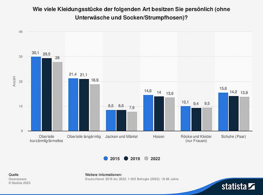 Laut einer Umfrage der Umweltorganisation Greenpeace zeigt sich allerdings zumindest hierzulande ein leicht rückläufiger Trend bei der Menge der Kleidungsstücke, die die Bevölkerung besitzt. Hingen im Jahr 2015 bei jeder Person noch durchschnittlich 30 kurzärmlige oder ärmellose Oberteile im Schrank, waren es im Jahr 2022 nur noch durchschnittlich 28. Insgesamt besaß jede Person in der Bundesrepublik im Jahr 2015 rund 100 Bekleidungsstücke (ohne Unterwäsche, Socken und Strumpfhosen), 2022 war diese Zahl auf 92 gesunken.