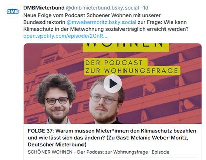 DMB-Bundesdirektorin Dr. Melanie Weber-Moritz war zu Gast bei „Schöner Wohnen – Der Podcast zur Wohnungsfrage“. Es ging um energetische Modernisierung als soziale Frage und wie sich soziales Wohnen und Klimaschutz zusammenbringen lassen. Weber-Moritz erklärte, wie mit dem „Drittelmodell“ Klimaschutz in der Mietwohnung sozial verträglich finanziert werden könnte.